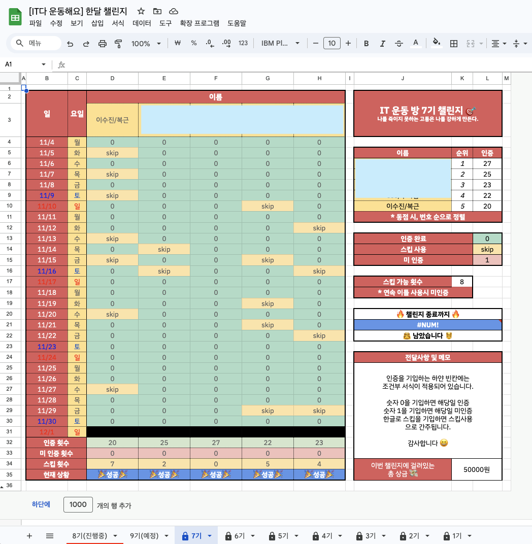 - 운동 : IT 다 봐요 운동방 챌린지를 재개했다. 1일 1운동중. 찍먹이지만 운동을 다시 재개했다는 것에 의의를 둔다.