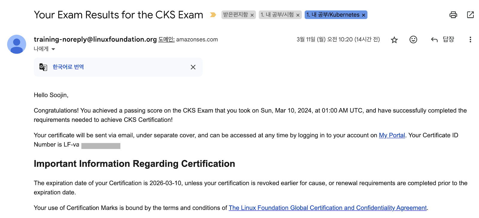 쿠버네티스 시험은 시험 종료 후 24시간 이내로 My Portal에 결과가 나오고 곧 합격 여부를 알리는 메일이 옵니다.