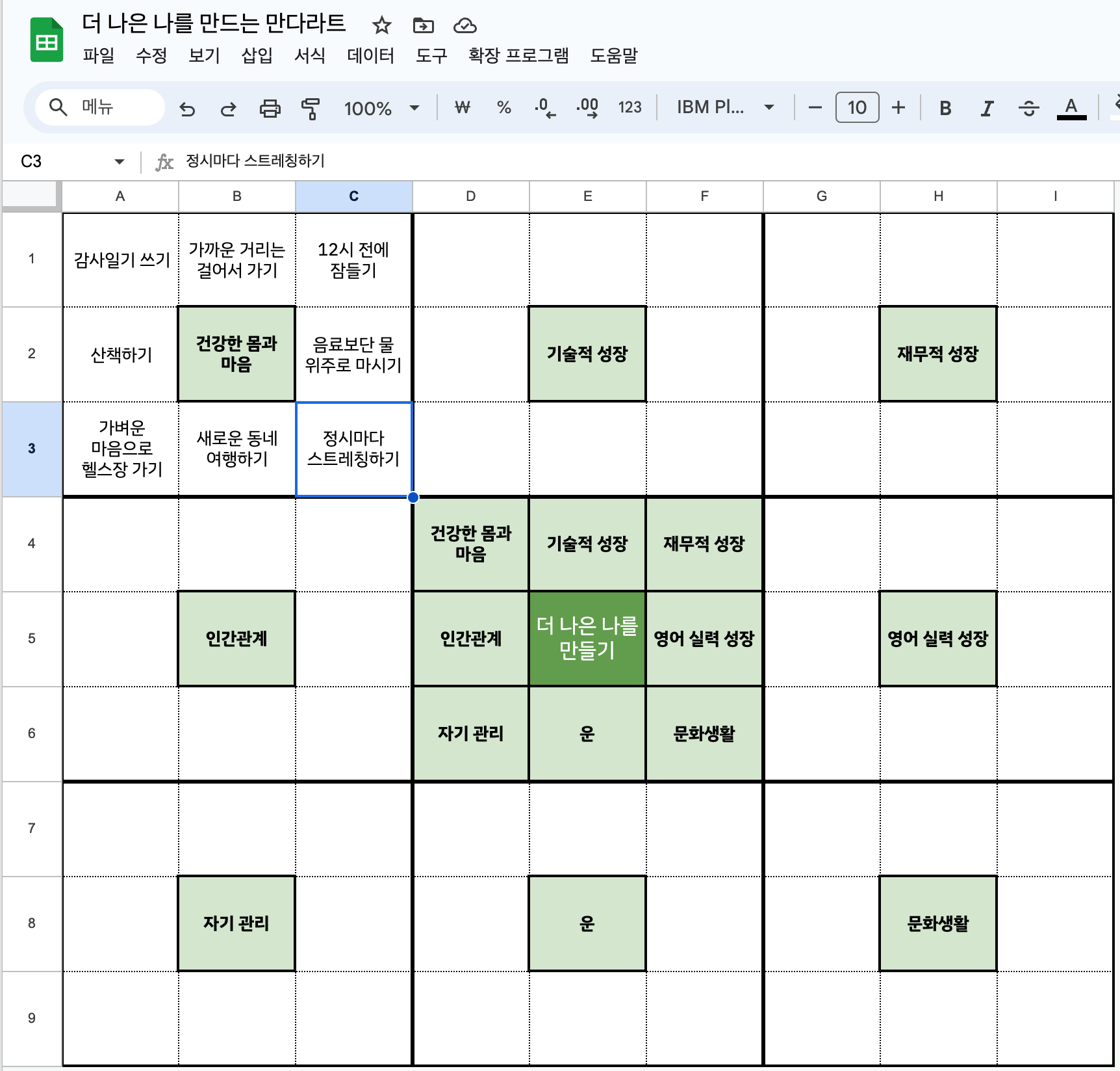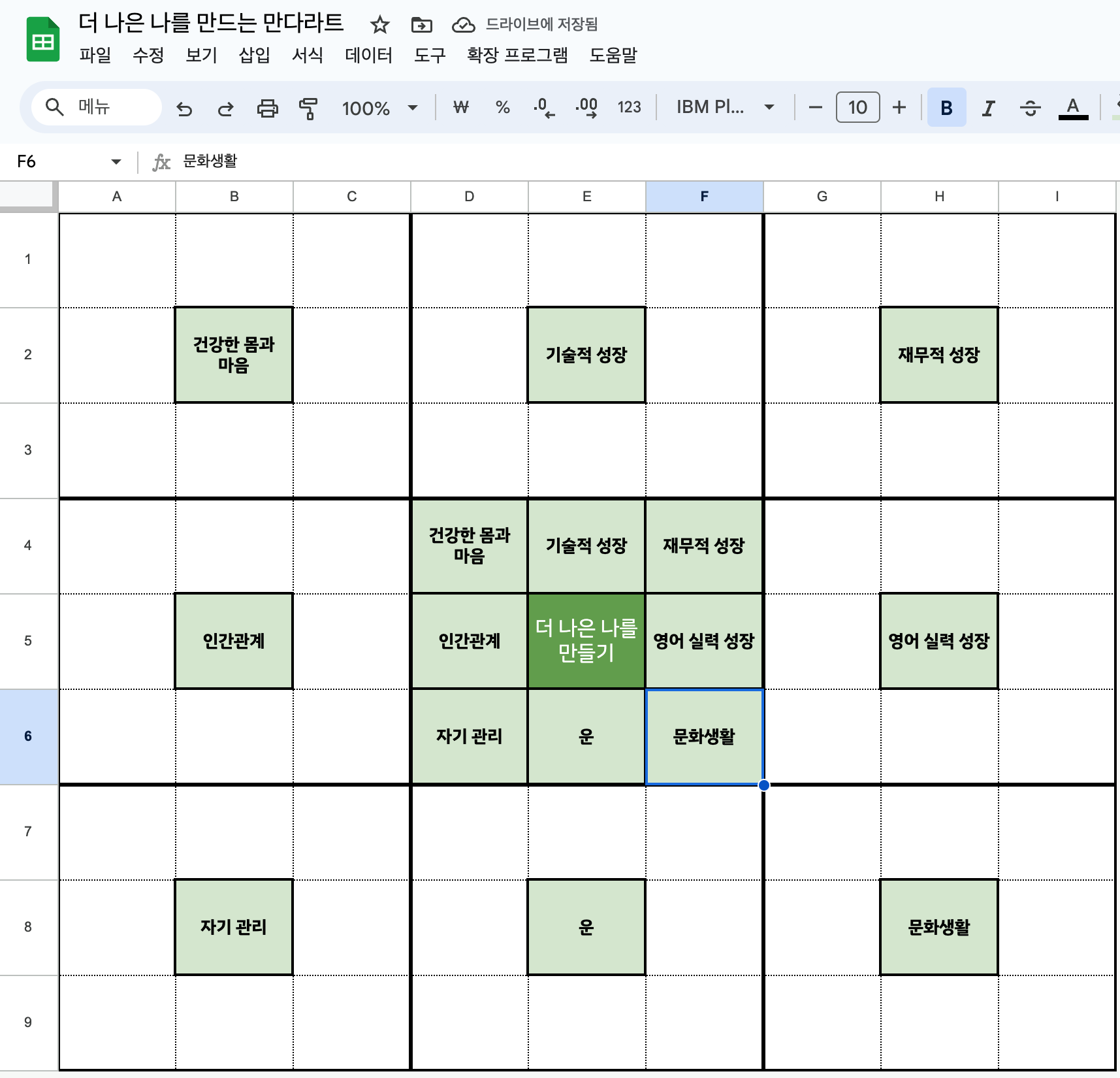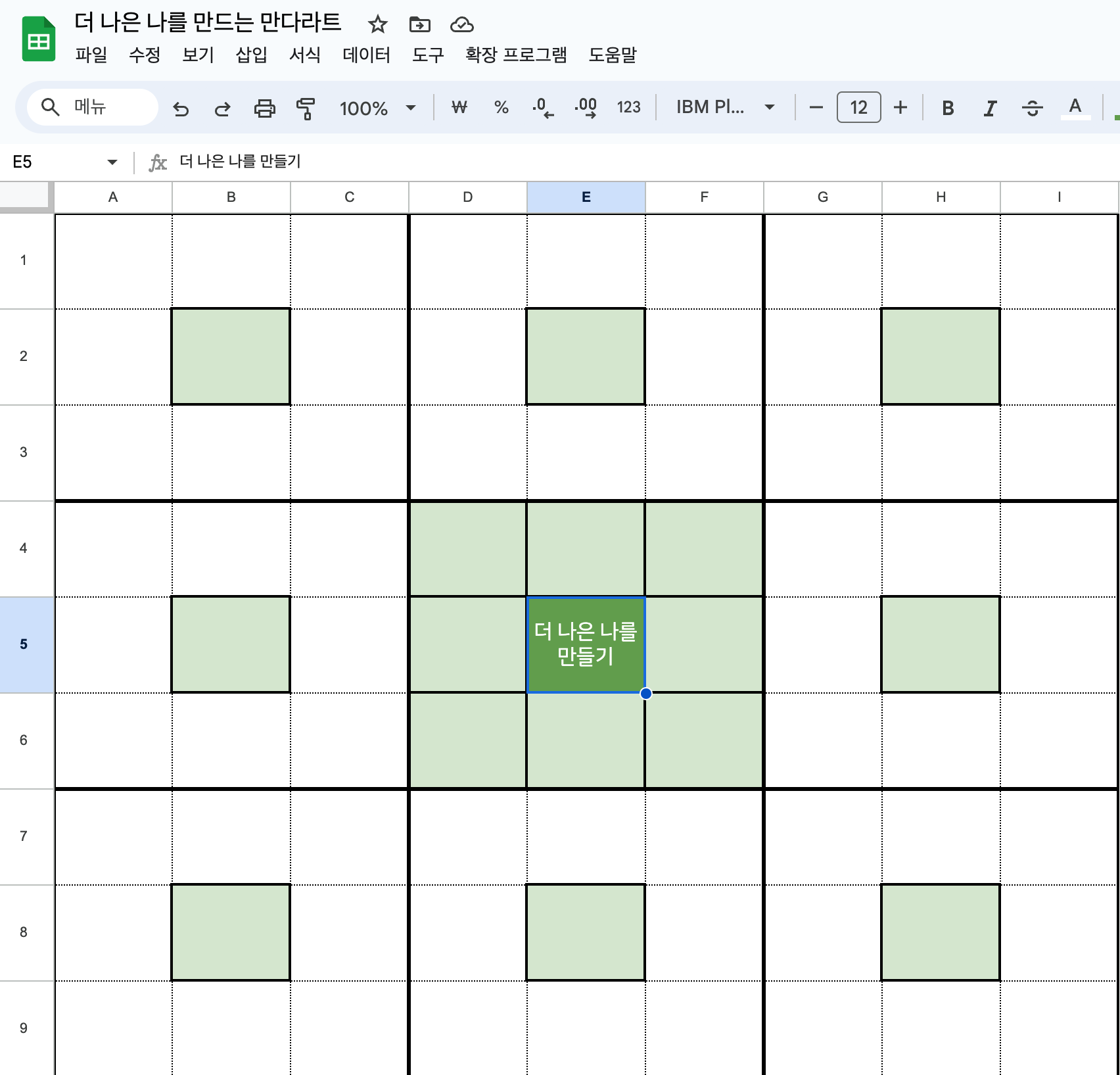 요약: 엑셀이 없어도 누구나 사본을 만드실 수 있도록 구글 스프레드시트로 만다라트 템플릿을 만들어보았습니다. 편하게 사용하세요 :)