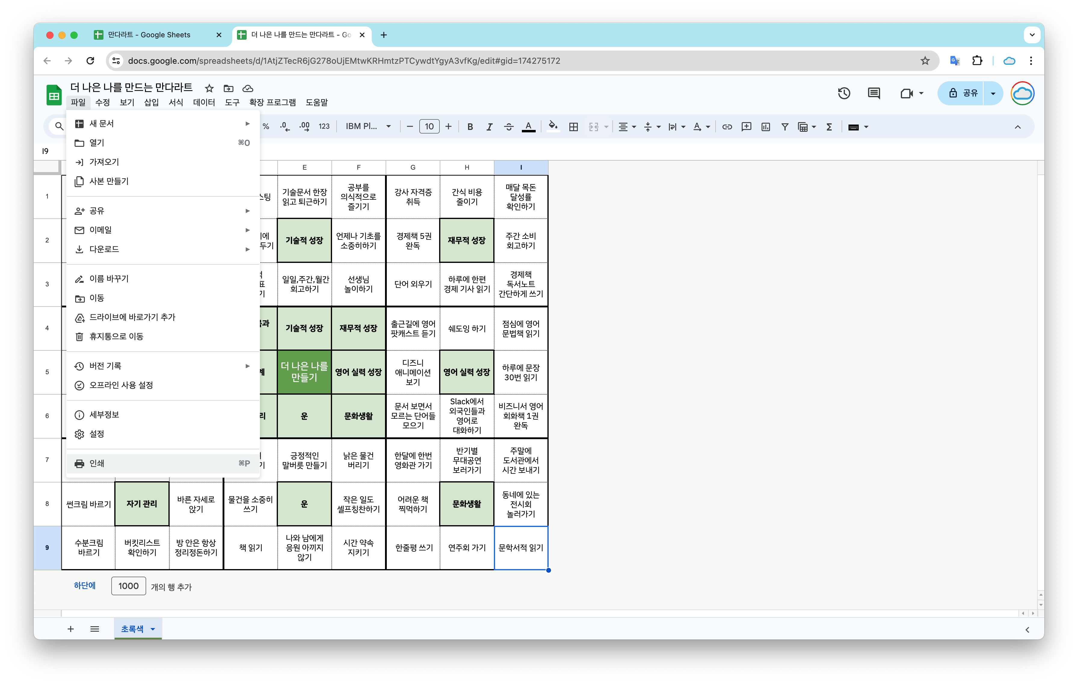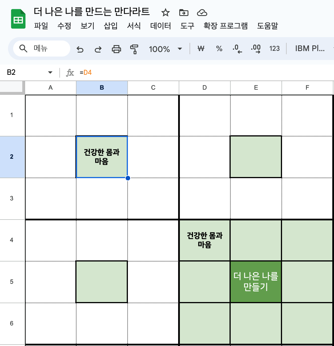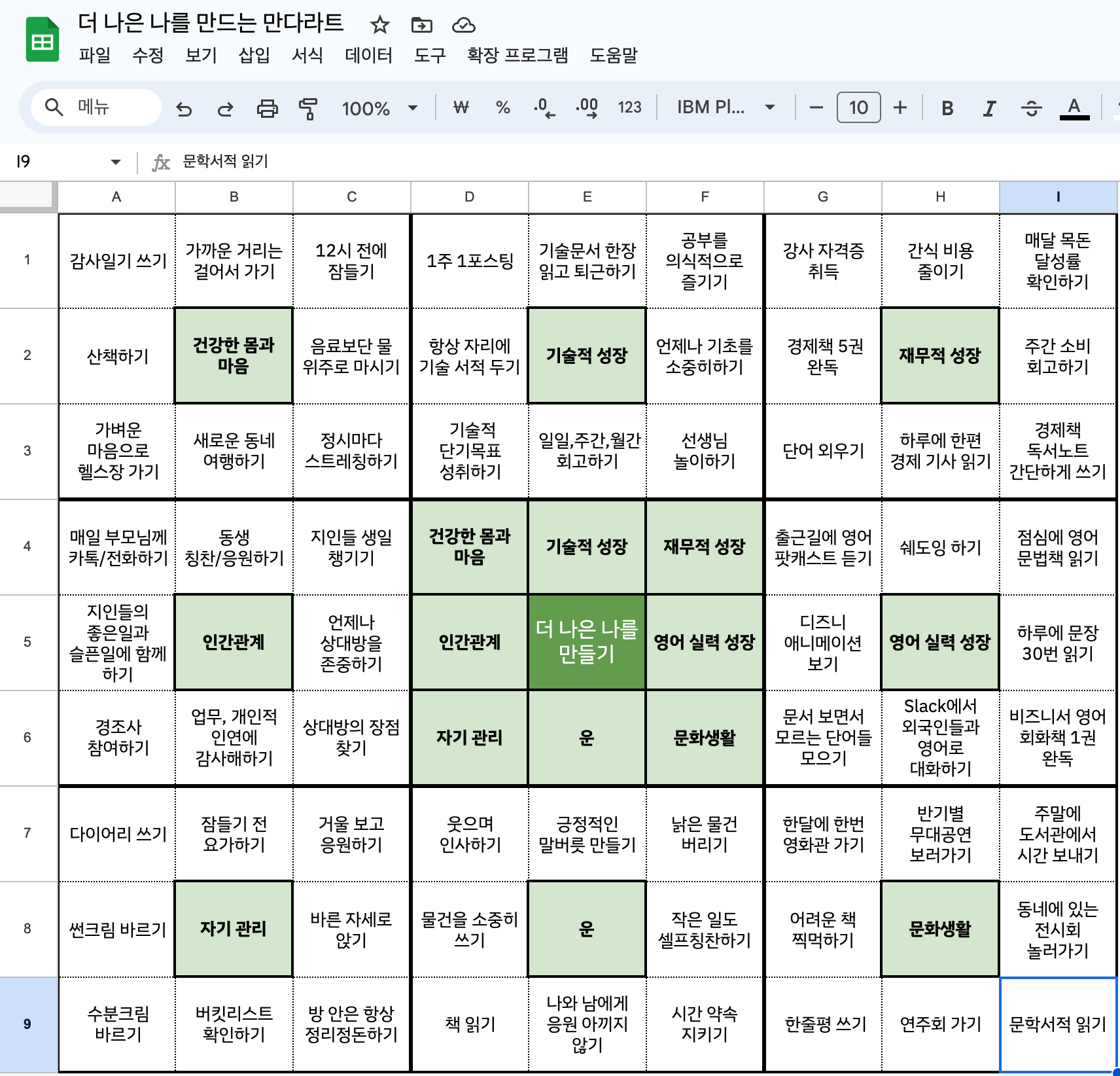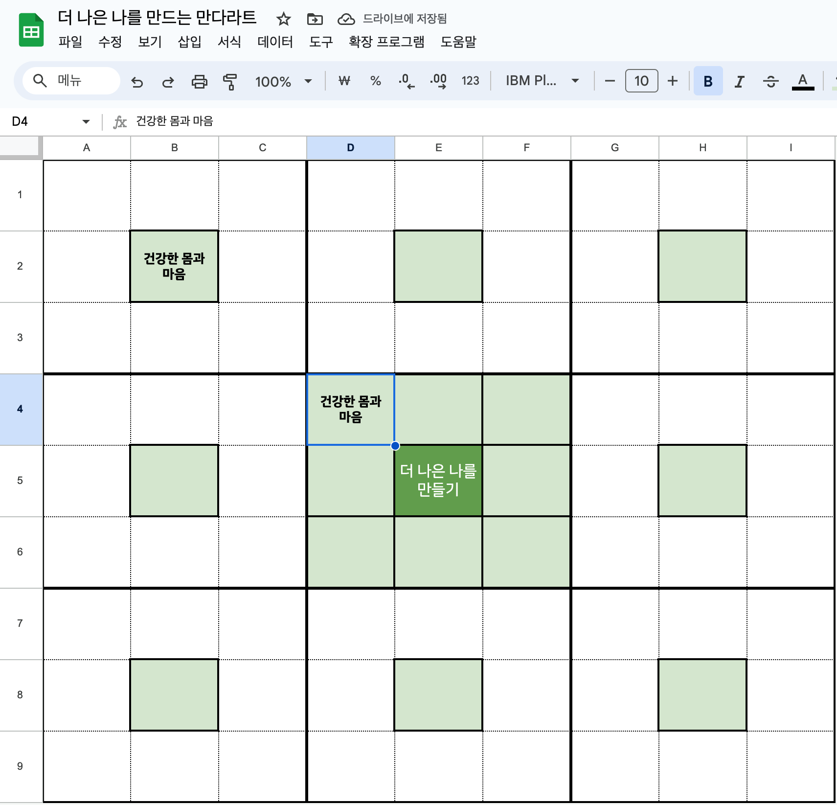 요약: 엑셀이 없어도 누구나 사본을 만드실 수 있도록 구글 스프레드시트로 만다라트 템플릿을 만들어보았습니다. 편하게 사용하세요 :)