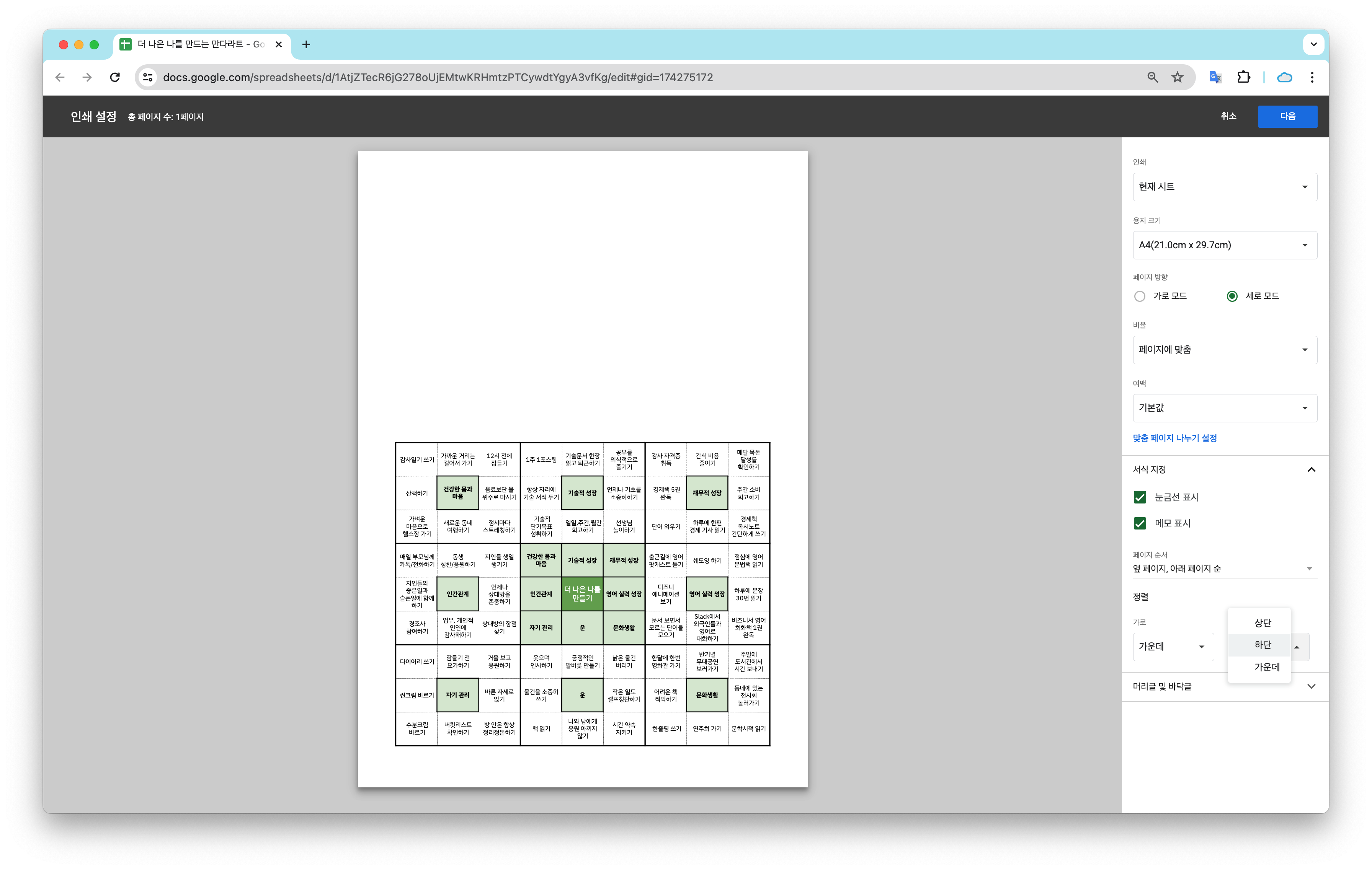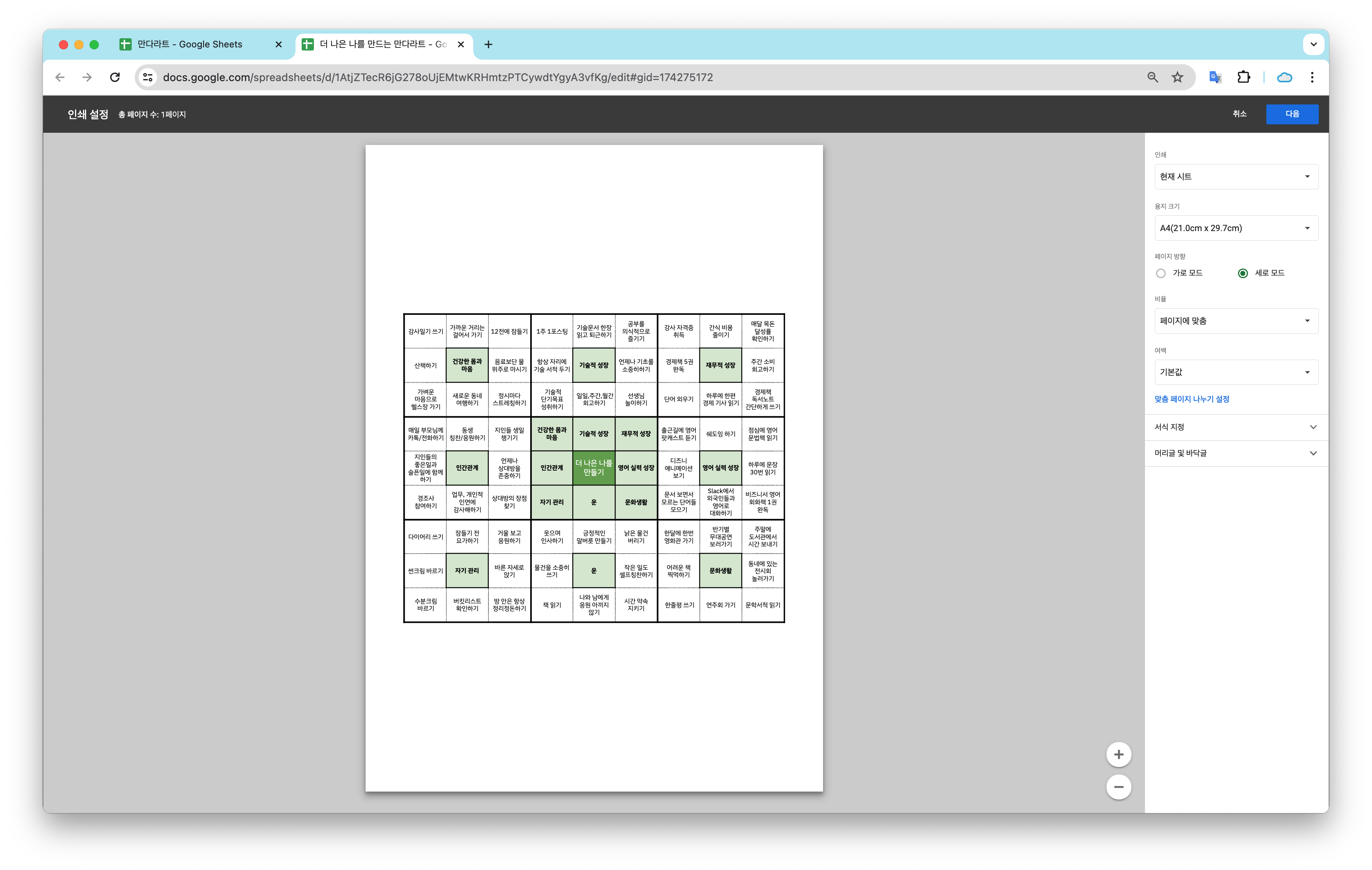 *아래부터는 선택사항입니다. 만다라트를 종이로 인쇄하고 싶으신 분은 아래 내용을 참고하세요. :)