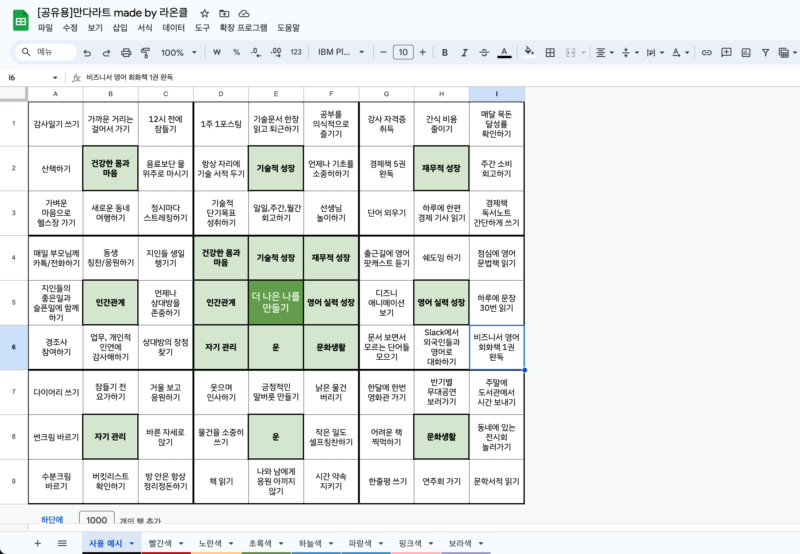현재 빨간색, 노란색, 초록색, 하늘색, 파랑색, 핑크색, 보라색 만다라트 탭을 만들어두었습니다.