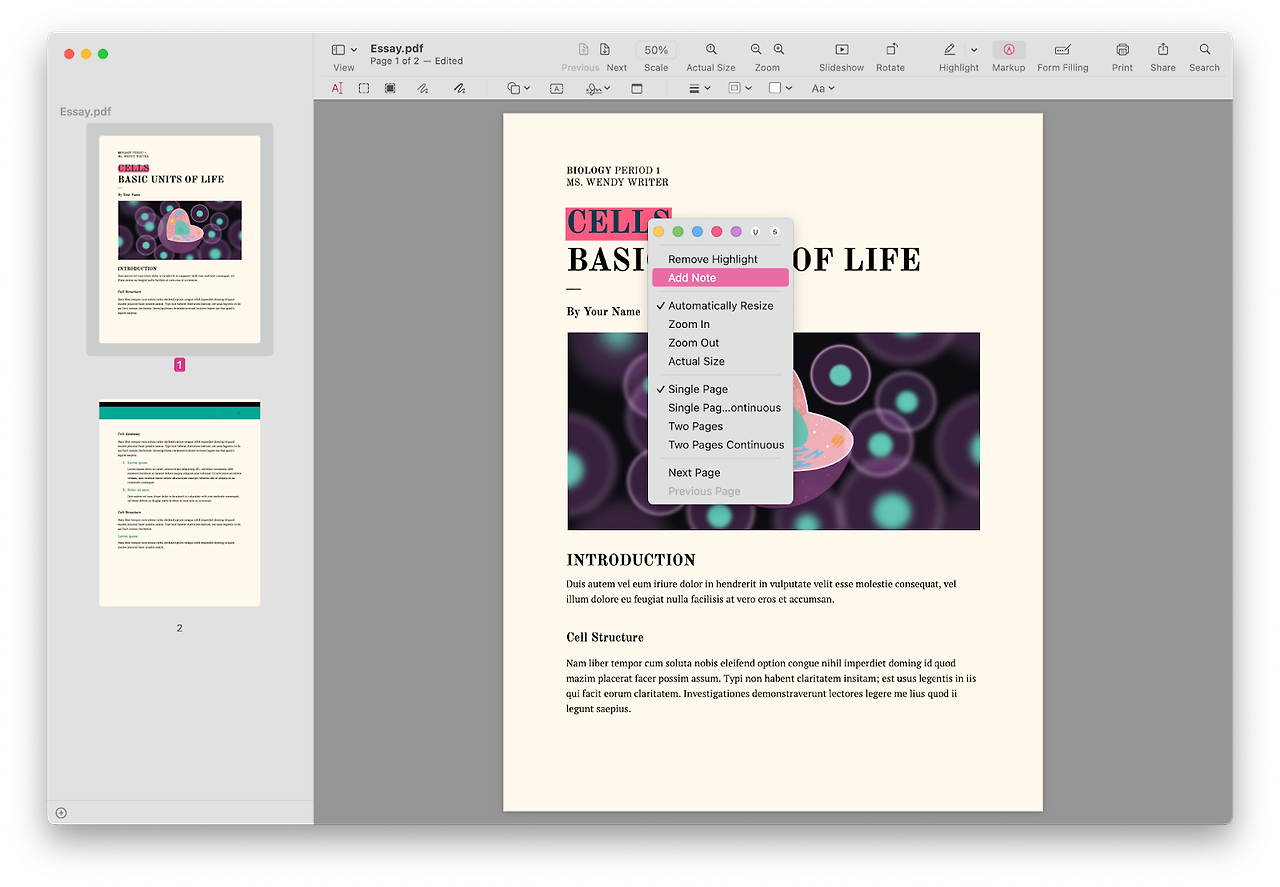 1. 하이라이트한 글자 위에서 우클릭 후, [Add Note]를 클릭합니다.
