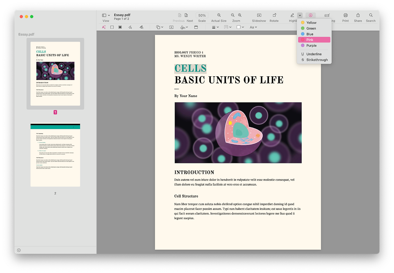 2. 메모하려는 단어를 드래그 한 후, Highlight 오른쪽 드롭다운 아이콘을 클릭하여 색깔을 선택합니다.(예시에서는 Pink)
