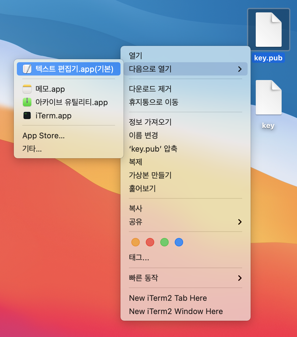 9. Public key를 텍스트 편집기 앱으로 엽니다.(우클릭 > 다음으로 열기 > 텍스트 편집기)