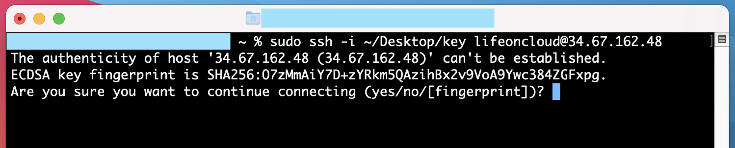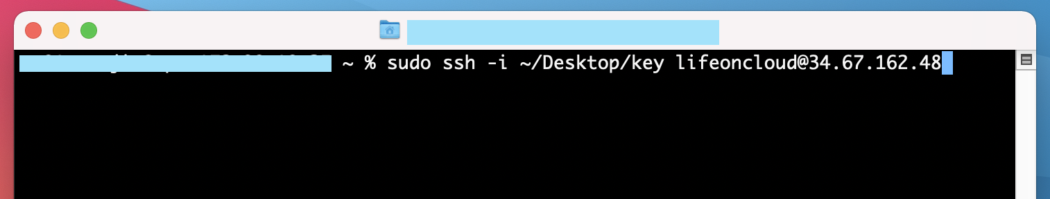 sudo ssh -i ~/Desktop/key lifeoncloud@34.67.162.48